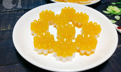 Vị ngọt béo, màu trắng tươi muốt của thạch sữa tươi quyện với vị chua ngọt đặc trưng của thạch xoài vàng óng ánh tạo thành một món thạch xoài vừa ngon vừa đẹp.