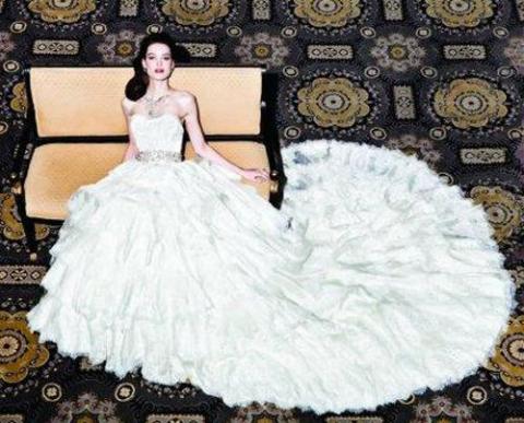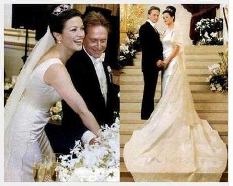 Catherine Zeta-Jones sở hữu một vẻ đẹp sang trọng và nhà thiết kế Christian Lacroix càng khiến điều đó trở nên rực rỡ hơn qua bộ váy cưới mà cô mặc năm 2000 khi kết hôn cùng Michael Douglas. Về chi tiết, chiếc váy có kiểu cổ hình chữ V mở rộng, tay trần, đuôi váy dài và đính kèm kim cương.