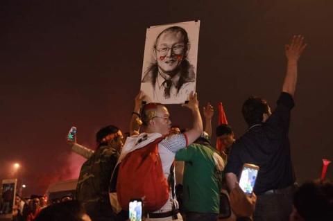 Một nhóm CĐV mang theo ảnh HLV Park Hang Seo ăn mừng chiến thắng ngay
