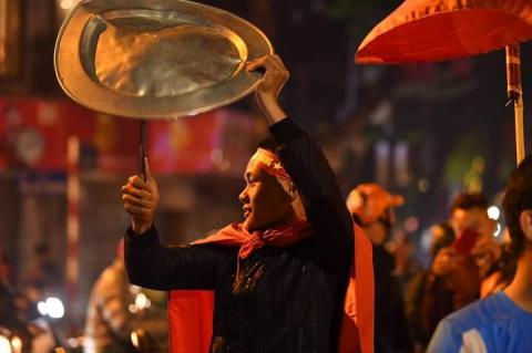 Nhiều CĐV mang theo mâm ra gõ hưởng ứng chiến thắng của đội nhà