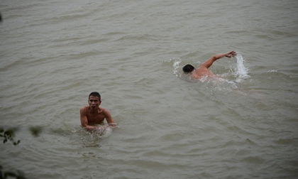 Nhưng thời tiết lạnh không thể cản được nhiều người dân Hà Nội đến bãi tắm sông Hồng bơi lội.