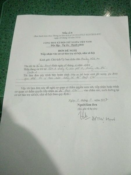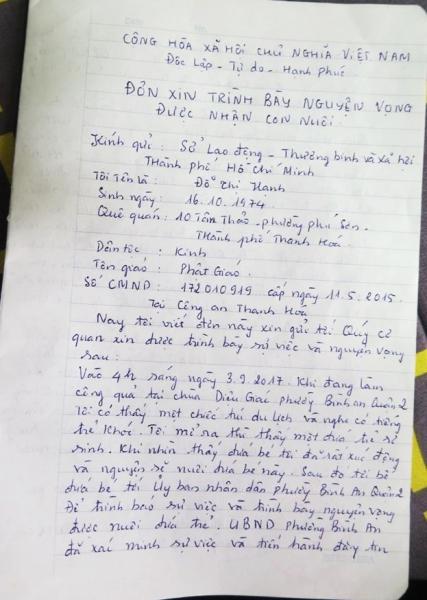 Lá đơn đề nghị cơ quan chức năng tiếp nhận bé Đỗ Pháp Chí vào cơ sở bảo trợ