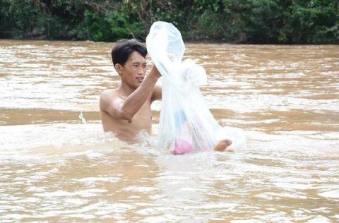 “Vào mùa mưa như hiện nay, nước lớn tràn về, bè mảng cũng không thể qua sông. Bởi vậy, phương tiện duy nhất là cho các cháu vào trong túi nilon bơi qua suối dữ đến trường”, anh Giống chia sẻ.