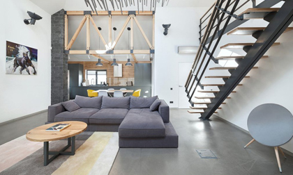 Cạnh phòng khách là cầu thang kim loại được thiết kế sát tường, vừa gọn