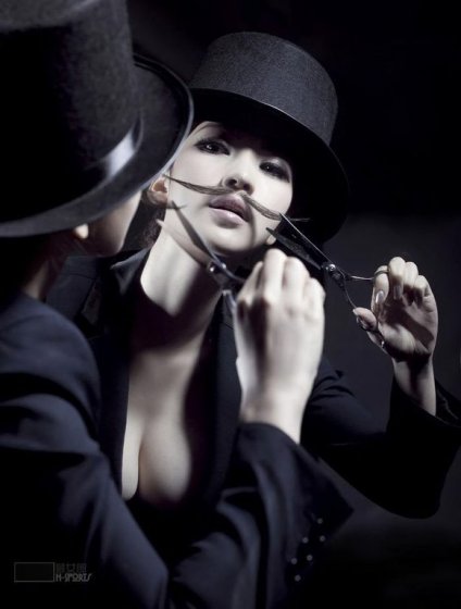 Người đẹp Liễu Nham trông khá "khác thường" khi giả trai. Chị cũng gắn râu giả, đội mũ, mặc vest đen nhưng lại cố tình để vòng một của mình cứ "lồ lộ" ra thế kia.
