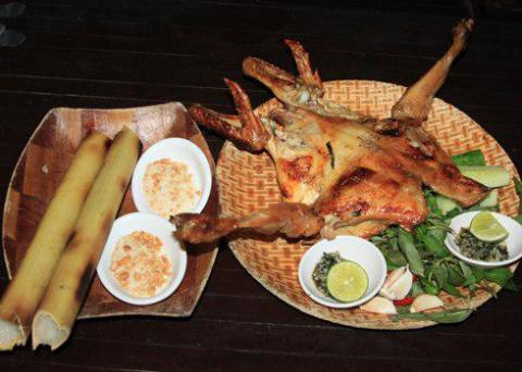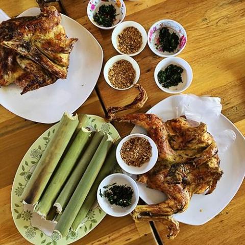 Thưởng thức cơm lam với gà nướng sả ớt thì không gì ngon bằng. Những con gà được thả, thịt dai, chắc được ướp cùng với chút muối cho đậm đà, ớt, sả và một chút mật ong rồi kẹp vào thanh tre nướng trên bếp lửa hồng đến khi thành một màu vàng ruộm, mỡ màng. Vị ngọt của mật ong quyện với vị ngọt của thịt, vị cay của ớt kích thích vị giác, khiến bạn cứ muốn ăn mãi.