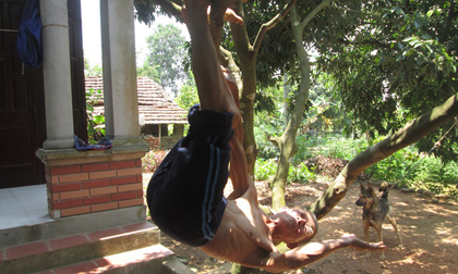 Nói đến đây, ông dẫn chúng tôi ra sân, chưa hiểu chuyện gì đang xảy ra thì ông đu mình lên cây, vắt vẻo, lộn ngược như Tôn Ngộ Không trong phim Tây Du Kí. Ở tuổi của ông, một thân hình dẻo dai, đó là niềm mơ ước của nhiều người.