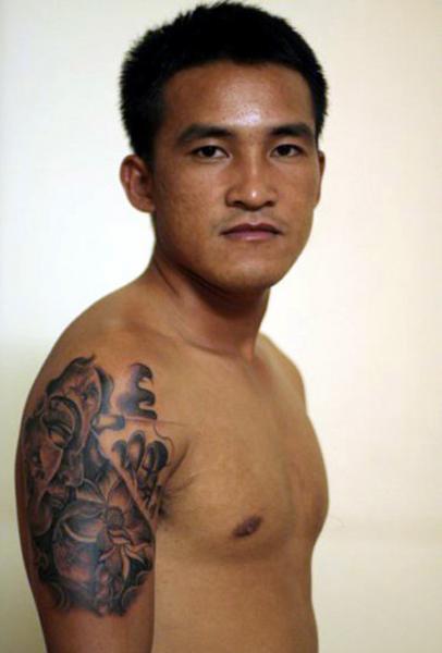 Hình xăm ấn tượng trên bắp tay trái của trung vệ Chí Công (Đồng Tâm Long An)