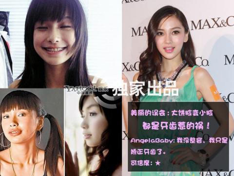 Angela Baby là cô nàng có hàm răng không được đều cho lắm nhưng vẫn tự tin “toe toét”, thêm vào đó là vầng trán khá rộng. MTV Trung Quốc bình luận Angela Baby nên viết một cuốn sách hướng dẫn cách làm đẹp và đảm bảo sẽ bán rất chạy. Cư dân mạng kết luận cô đã phẫu thuật chỉnh nha để có hàm răng đều, mắt cũng to hơn và xinh đẹp lên rất nhiều.