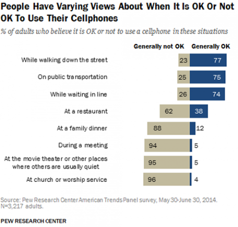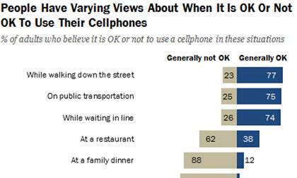 Theo Huffington Post, Trung tâm nghiên cứu Pew đã thực hiện một nghiên cứu với 3.000 người sử dụng điện thoại, để khảo sát tỉ lệ đồng tình hay phản đổi việc sử dụng smartphone trong một số tình huống như bữa ăn tối gia đình, cuộc họp, hội ngộ bạn bè, dạo phố, trong khi đi xe buýt,...