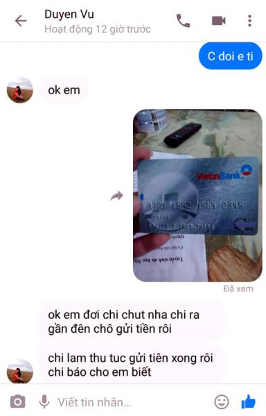 Theo chị T. trình bày, vào lúc 4 giờ 50 phút ngày 9-6, tài khoảng facebook có tên Duyen Vu có nhắn tin cho chị hỏi thăm. Đến 20 giờ 55 phút ngày 12-6, tài khoản này tiếp tục nhắn tin hỏi thăm sức khỏe của chị và gia đình. "Sau khi tôi trả lời, người này nói với tôi "chị đang ở bên Úc" và hỏi tôi có dùng thẻ ATM không để xin số tài khoản gửi tiền về cho người thân. Vì biết chủ tài khoản Duyen Vu là chị Nguyễn Thị Mỹ Duyên, người quen trong thôn vừa đi Úc nên tôi nói mình có sử dụng thẻ ATM và đồng ý cho số tài khoản".