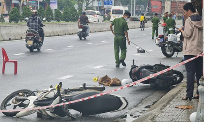 Sau khi cướp ngân hàng, các đối tượng lên xe máy bỏ chạy được 50m thì bất ngờ va chạm với một xe máy của người dân đi cùng chiều.