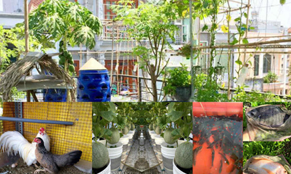 Khu vườn trên sân thượng tầng 3 với diện tích 80m2 phủ kín rau xanh, quả ngon và nuôi gà, cá sạch được anh Lê Bạch Thái Thuyên (TP.HCM)