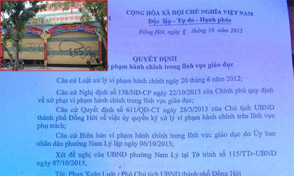 UBND TP Đồng Hới (Quảng Bình) đã ra quyết định xử phạt hành chính 22,5 triệu đồng đối với bà Trần Thị Thuý Hằng, chủ cơ sở mầm non Sơn Ca, đồng thời giải thể cơ sở này.