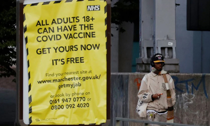 Một người đàn ông đi ngang qua tấm biển kêu gọi người dân đi tiêm vaccine COVID-19