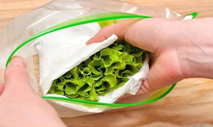 Sau khi rửa sạch rau quả, bạn vẩy cho ráo nước rồi cho rau vào khăn giấy bọc lại, tiếp đến cho vào túi ziplock và kéo kín khóa lại. Bạn lưu ý rằng, càng ít không khí bên trong túi thì càng tốt. Tiếp đến bạn đặt túi vào trong ngăn mát tủ lạnh.