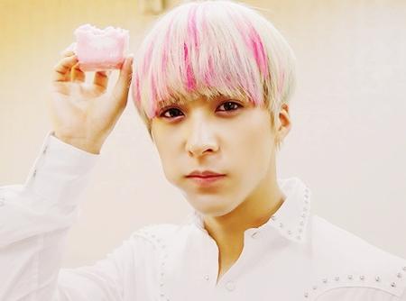 Ca sĩ Dongwoon của nhóm nhạc Beast cũng điệu đà không kém với các lọn tóc phẩy line hồng.