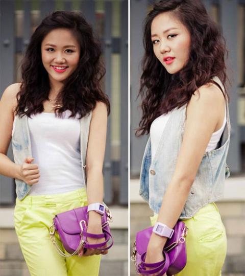 Văn Mai Hương trẻ trung như đúng lứa tuổi của mình khi diện áo gile jeans kết hợp với áo ba lỗ và quần kaki vàng.