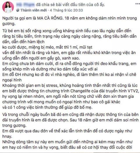 Được biết cô gái này sinh ra và lớn lên ở Quảng Bình, từ nhỏ vì mắc phải thiểu sản xương hàm trên nên thật khó để Hà nở được nụ cười tươi rạng rỡ như bao bạn đồng trang lứa khác. Không những thế, do ngoại hình kém bắt mắt nên nữ sinh này cũng chịu sự dè bỉu, chọc ghẹo từ những người xung quanh, cũng vì thế mà Hà chẳng dám đối diện với ai, dần dần trở nên mặc cảm với chính bản thân mình.