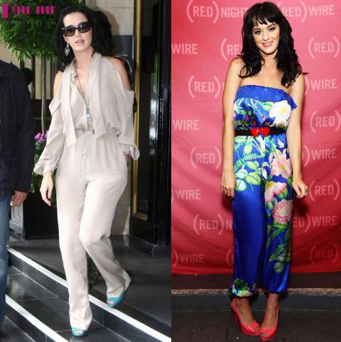 Katy Perry trông như viên kẹo ngọt trong bộ jumpsuit lụa với hoạ tiết Haiwaii này. Đó là còn chưa kể tới chiếc thắt lưng mặt trái tim và đôi giày màu hồng fuchsia xinh xắn mà cô kết hợp thêm.