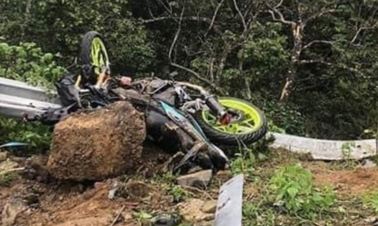 Xe máy do nam thanh niên điều khiển hư hỏng nặng phần đầu, mắc vào lan can đường