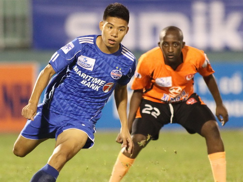 B.BD (trái) đang sa sút không phanh sau khi chiến thắng Sài Gòn FC (Ảnh: Quang Nhựt)
