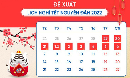 Theo phương án lịch nghỉ Tết Nguyên đán Nhâm Dần 2022 mà Bộ LĐTB&XH gửi Thủ tướng, thì người lao động được nghỉ Tết 9 ngày. Trong đó gồm 1 ngày trước Tết, 4 ngày sau Tết và 4 ngày nghỉ cuối tuần (thứ Bảy, Chủ nhật) của tuần trước và sau Tết.