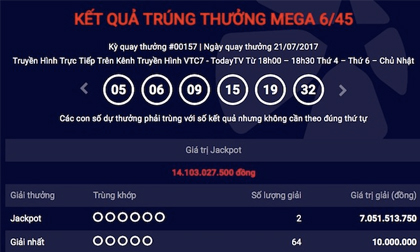 Trong khi giải jackpot trị giá 132 tỉ đồng của kỳ quay 156 (mở thưởng hôm 19/7) chưa kịp “nguội”, thì ở kỳ quay 157 vào chiều tối 21/7 lại tìm được chủ. Đặc biệt, jackpot của kỳ quay 157 có tới 2 chủ nhân cùng sở hữu.