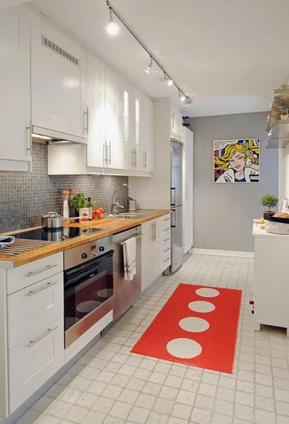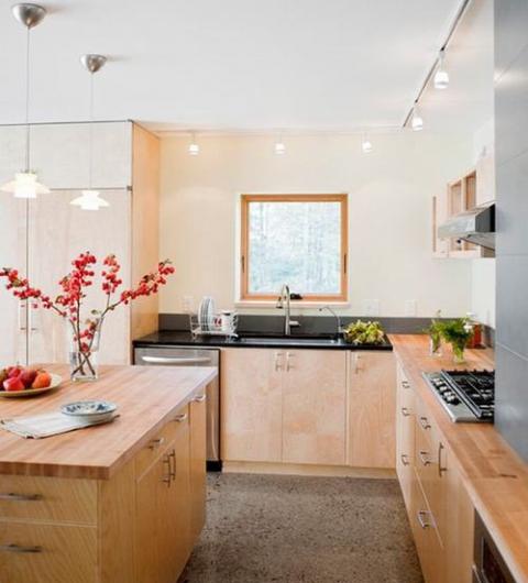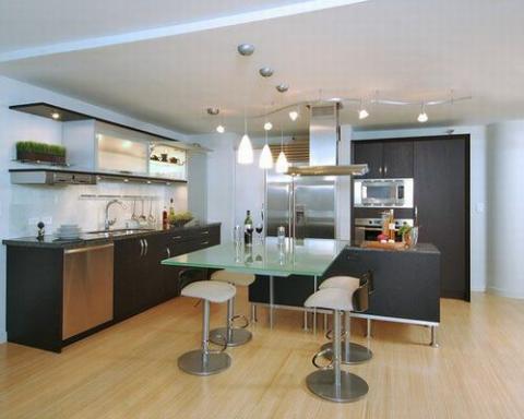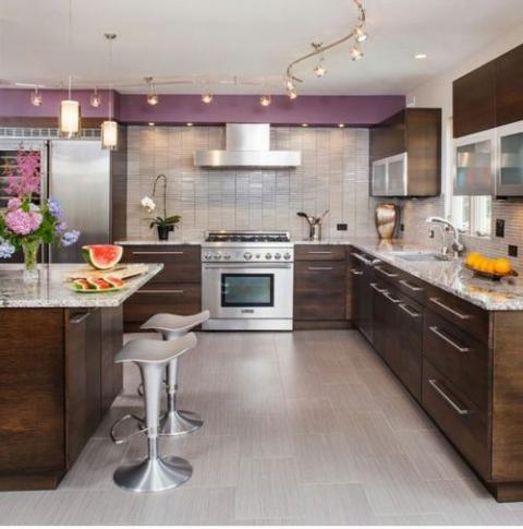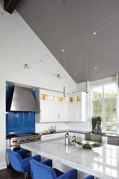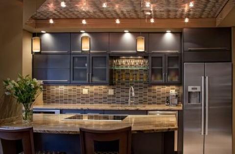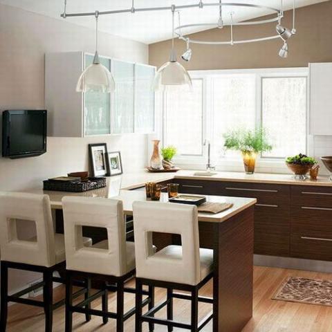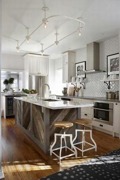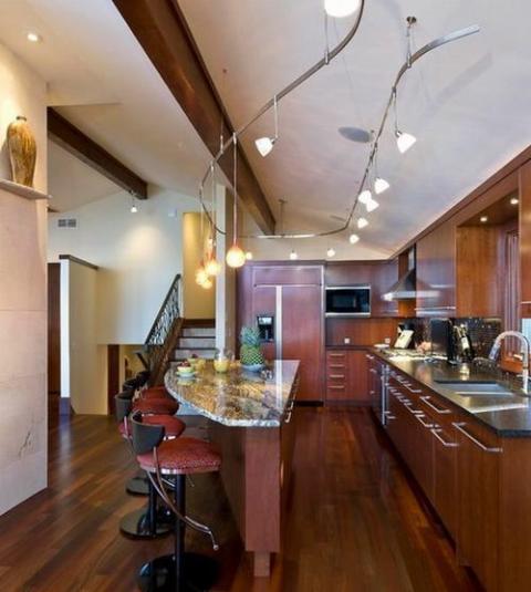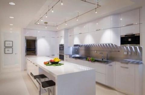 Đèn chiếu rọi track lighting là lựa chọn phổ biến trong những ngôi nhà hiện đại. Chúng có thể được sử dụng ở bất kỳ không gian nào trong nhà với đa dạng hình dáng, kích thước và phong cách thiết kế. Đèn track lighting cung cấp ánh sáng với cường độ khác nhau ở những góc nhìn khác nhau. Trong nhà bếp đèn chiếu rọi thường được lắp đặt phía trên đảo bếp. Lựa chọn đèn có phong cách và màu sắc hài hòa vời nội thất của căn phòng.