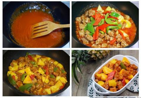 Thêm 25g đường vào chảo sốt cà chua, 15ml giấm gạo rồi đảo đều. Cho một ít bột ngô vào bát nước hòa tan rồi đổ vào chảo sốt cà chua rồi khấy đều. Tiếp đó cho dứa, thịt đã chiên, ớt chuông vào đảo chung. Bạn đun cho đến khi nước sốt sánh lại và phủ đều thịt, dứa thì tắt bếp.