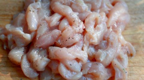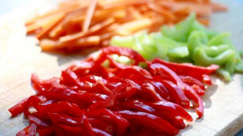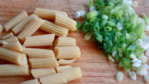 Các loại rau cắt theo yêu cầu và thịt gà thái miếng.