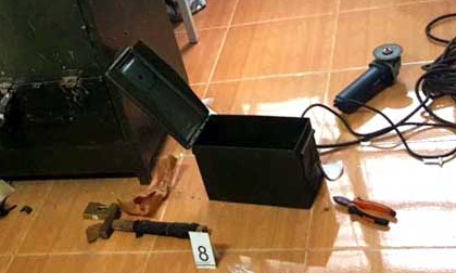 Tủ sắt bị Hiếu cắt phá lấy trộm 2 khẩu súng cùng 16 viên đạn.