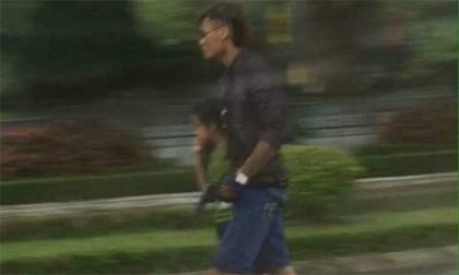 Đối tượng nam giới mặc áo sơ mi tối màu, quần xanh đang khống chế một bé trai khoảng chừng 10 tuổi, trên tay cầm theo một khẩu súng ngắn.