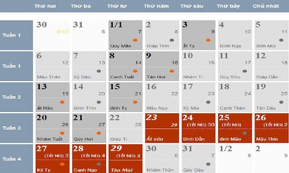 Cụ thể, người lao động sẽ nghỉ từ ngày thứ năm ngày 23-1-2020 (tức 29 Tết ) đến hết thứ tư ngày 29-1-2020 (tức Mùng 5 Tết Canh Tý 2020). Trong đó được nghỉ 5 ngày Tết Âm lịch theo quy định (gồm 2 ngày cuối năm Kỷ Hợi và 3 ngày đầu năm Canh Tý) và thêm 2 ngày nghỉ bù (do mùng 1 và mùng 2 Tết trùng vào thứ bảy và chủ nhật nên được nghỉ bù vào mùng 4 và mùng 5 Tết).