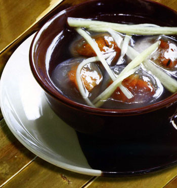 | Chè thịt heo quay:Trong các món ăn nổi tiếng xứ Huế, món chè thịt tiến vua này nghe lạ tai nhất. Với sự kết hợp kỳ lạ giữa những nguyên liệu đối lập, thực khách phải vượt qua cảm giác e ngại ban đầu mới có thể cảm nhận trọn vẹn vị mặn ngọt, vừa nóng vừa lạnh với lớp vỏ giòn dai, nhân thịt quay đậm đà, nước chè đường trong veo thơm mùi gừng theo đúng kiểu đất cố đô. Chè bột lọc heo quay có mặt trong các quán chè trong chợ Đông Ba, chè hẻm Hùng Vương trứ danh, những quán chè gần trường học… với giá từ 10.000 đồng. Ảnh: Nét Huế. |