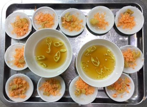 | Bánh bèo: Món ăn đầy tinh tế của người dân xứ Huế này có thể tìm thấy ở bất cứ đâu quanh đất cố đô. Bánh bèo được để trong các chén nhỏ, rắc tôm thịt, ăn với nước mắm ớt rất ngon. Ảnh:Hương Giang. |