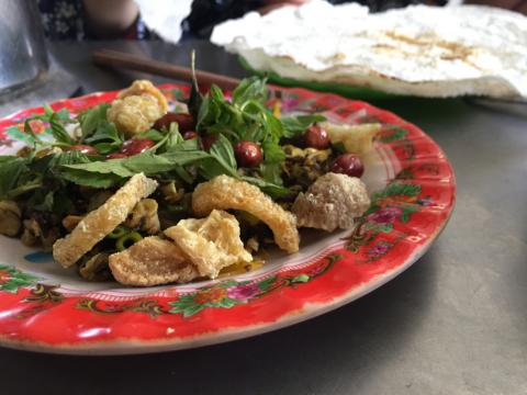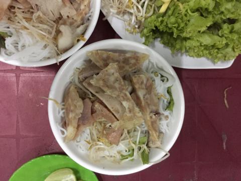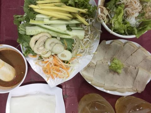 | Bánh ướt cuốn thịt heo: Thịt heo luộc chín, xắt lát mỏng, rau sống chủ yếu là xoài xanh, chuối chát, rau thơm, xà lách, diếp cá. Cuốn một miếng bánh tráng với thịt heo, rau sống, chấm vào mắm nêm đậm đà đã được pha sẵn ớt, tỏi, vị ngon thực sự không cưỡng nổi. Ảnh: Hương Giang. |