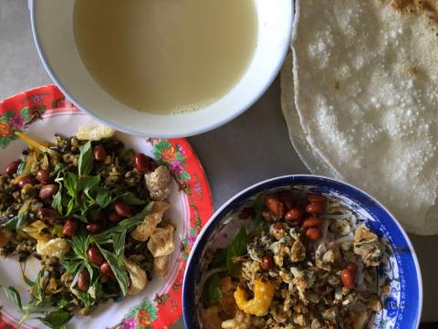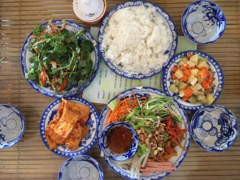 | Cơm chay:Huế có rất nhiều chùa chiền, đó cũng chính là lý do cơm chay Huế mang nhiều màu sắc hơn cả với những biến tấu độc đáo. Để thưởng thức một bữa cơm chay đầy đặn vào buổi trưa, bạn chỉ cần bỏ ra 25.000 đồng. Ảnh:Hương Giang. |