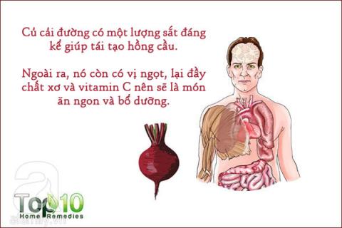 Để phòng ngừa thiếu máu, một trong những thực phẩm tốt nhất mà bạn nên ăn là củ cải đường. Loại củ này có một lượng sắt đáng kể giúp tái tạo hồng cầu. Ngoài ra, nó còn có vị ngọt, lại đầy chất xơ và vitamin C nên sẽ là món ăn ngon và bổ dưỡng.
