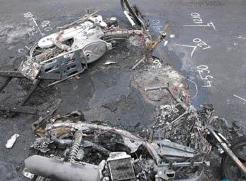 Tại hiện trường, hai xe máy bị thiêu rụi chỉ còn trơ khung sắt, nhiều vết dầu bị đổ tràn ra đường. Đám cháy còn làm 1 cột điện chiếu sáng công cộng gần đó bị cháy đen và một phần mái hiên nhà dân bị hư hỏng.