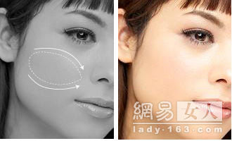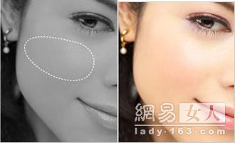 - Dùng ngón tay chấm phấn má dạng gel, sau đó chấm lên giữa má, rồi tán ra ngoài theo hình bầu dục