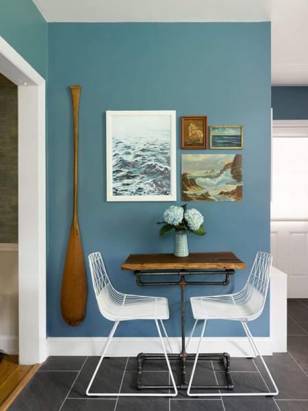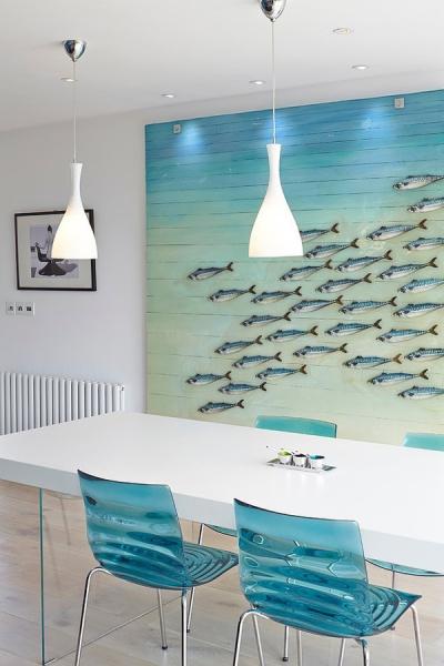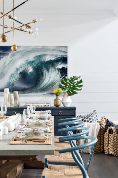 Bức tranh về biển hòa nhập với màu sắc của nội thất trong phòng ăn.
