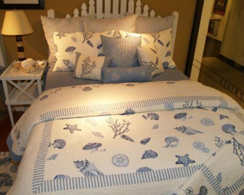 Bộ ga, gối, đệm được trang trí với chủ đề biển cả.