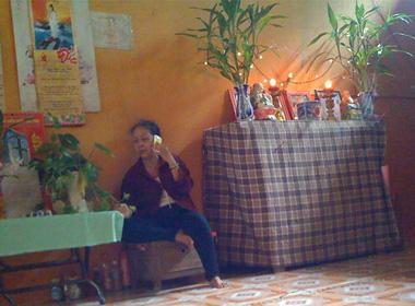 Quay sang chúng tôi, "cô Hai" nói: “Nãy giờ như xem bệnh rồi đó. Ngày 22 mình cậu trở lại đây, quý cô sẽ cho cậu biết bệnh gì ví dụ như bệnh ung thư hay gì đó. Nếu ung thư không chừng phải đi bác sĩ đó, ở đây đâu có thuốc gì đâu mà trị, chỉ có nước thánh thôi hà” - cô Hai vừa nói vừa cười lớn giọng.