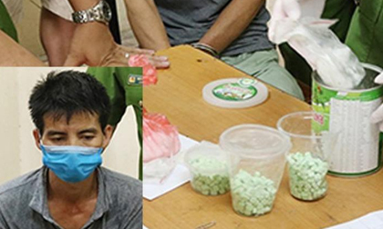 Tang vật thu giữ gồm 25,6 gam tinh thể màu trắng và 66 viên nén màu xanh có trọng lượng 26,6 gam.