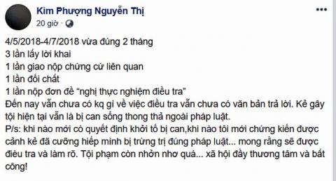 Chia sẻ trên trang cá nhân, người mẫu Kim Phượngthể hiện sự 'nóng ruột' về thông tin mới của vụ việc khi viết “ 4/5/2018-4/7/2018 vừa đúng 2 tháng,3 lần lấy lời khai, 1 lần giao nộp chứng cứ liên quan, 1 lần đối chất, 1 lần nộp đơn đề “nghị thực nghiệm điều tra”. Đến nay vẫn chưa có kết quả gì về việc điều tra cũng như chưa có văn bản trả lời. Kẻ gây tội hiện tại vẫn là bị can sống thong thả ngoài pháp luật".