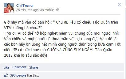 Đến ngày 5/2, Cục Nghệ thuật Biểu diễn đã chính thức ký cấp tem cho phép phát hành đĩa "Táo quân 2013" sau 4 lần chỉnh sửa nội dung. Theo đó, những phần bị cho là có chứa những nội dung không phù hợp với thuần phong mỹ tục đã được chỉnh sửa. Với sự tham gia của nhiều tên tuổi danh hài nổi tiếng trên cả nước “Táo quân 2013” đã ra đĩa ngày 7/2 trên cả nước. Và 20h tối nay vào đêm Giao thừa Tết Quý Tỵ, chương trình “Táo quân” sẽ chính thức lên sóng VTV thỏa mãn bao niềm mong đợi của khán giả truyền hình trên cả nước. Trước giờ G, táo Giao thông – Chí Trung đã có những chia sẻ rất sâu sắc của người làm nghề. Bức tâm thư ngay khi được cập nhật trên facebook cá nhân của danh hài đã nhận được hàng trăm comment và những ý kiến ủng hộ.