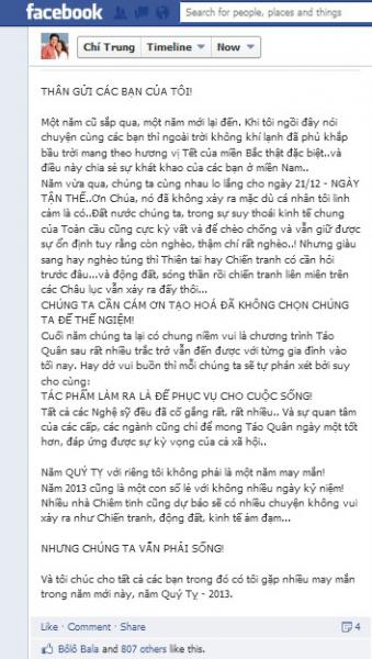 Sau những lùm xùm liên quan đến chương trình Táo Quân 2013 , do Trung tâm sản xuất phim Truyền hình, Đài THVN (VFC) sản xuất, khi bị Cục Nghệ thuật biểu diễn (NTBD) yêu cầu tạm ngưng mọi hoạt động phát hành đĩa hay chuẩn bị lên sóng do có chứa những nội dung không phù hợp với thuần phong mỹ tục. Táo giao thông – Chí Trung đã có một bức tâm thư gửi đến toàn bộ khán giả với những lời lẽ hết sức sâu sắc. Bức tâm thư nhận được không ít sự đồng cảm từ phía khán giả xem truyền hình trong nước.