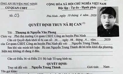 Ngày 10/4, tin từ cơ quan Cảnh sát điều tra Công an huyện Phú Ninh, tỉnh Quảng Nam, Thượng tá Nguyễn Văn Phong, Phó Thủ trưởng đơn vị vừa ra quyết định truy nã bị can đối với Nguyễn Trung Thành, SN 1988, trú thôn Tú Hội, xã Tam Thành, huyện Phú Ninh.