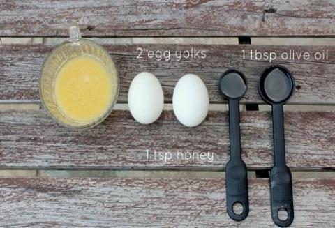 Tùy thuộc vào độ dài của mái tóc, bạn có thể sử dụng một hoặc hai quả trứng. Công thức hiệu quả là một lòng đỏ trứng gà trộn với một muỗng canh dầu dừa (có thể thay bằng loại dầu phù hợp theo sở thích), một muỗng canh mật ong và hai muỗng canh nước.